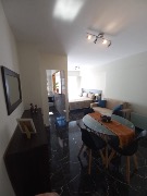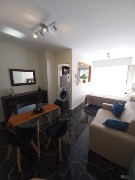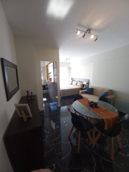Ambiente con frente abierto con pisos en cerámicos con balcón saliente, cocina con barra desayunadora revestida en cerámico con heladera, termotanque eléctrico, cocina, lavarropas, microondas, baño revestido en cerámico con plediluvio y mampara, Placard pintado. Totalmente amoblado, calefactor, luces y apliques.